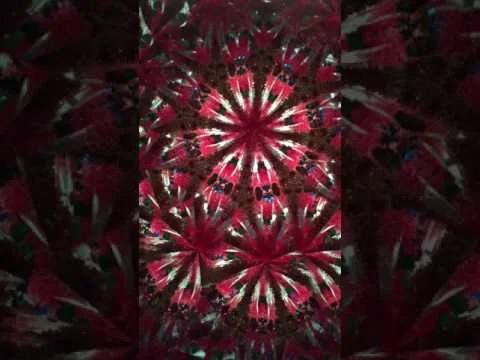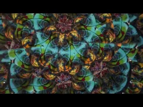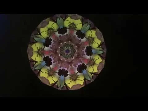 Unconventional kaleidoscope in which 3 pairs of mirrors are combined to produce a complex image with 3 mandalas combined.