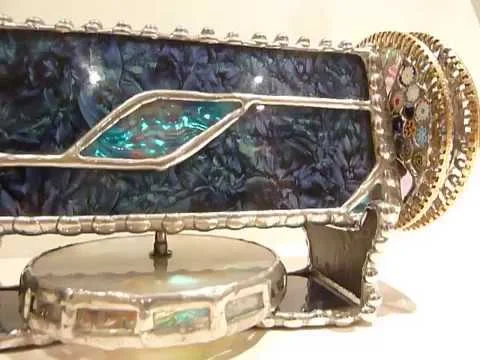Mini tumblescope is similar in form to the wheelscope but In this case the image is created by arabesques of lampworked glass, freely tumbling as the wheel is rotated.